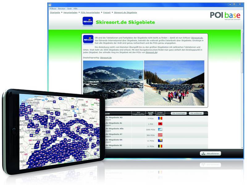 Skiresort.de, das weltweit größte Skiportal, nutzt die Software POIbase um Skifahrern und Snowboardern die gewünschten Skigebiete und viele aktuelle Zusatzinfos jetzt auch auf das Navigationssystem zu übertragen.