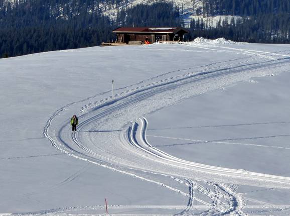 Die Loipe führt von der Bergstation der Almbahn II über die Loferer Alm.