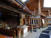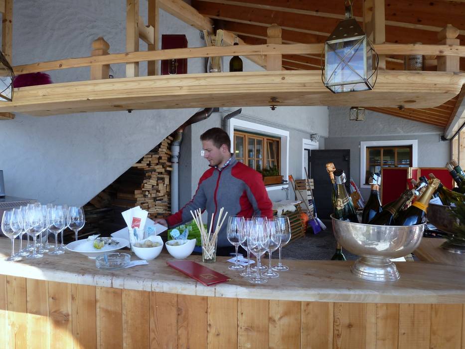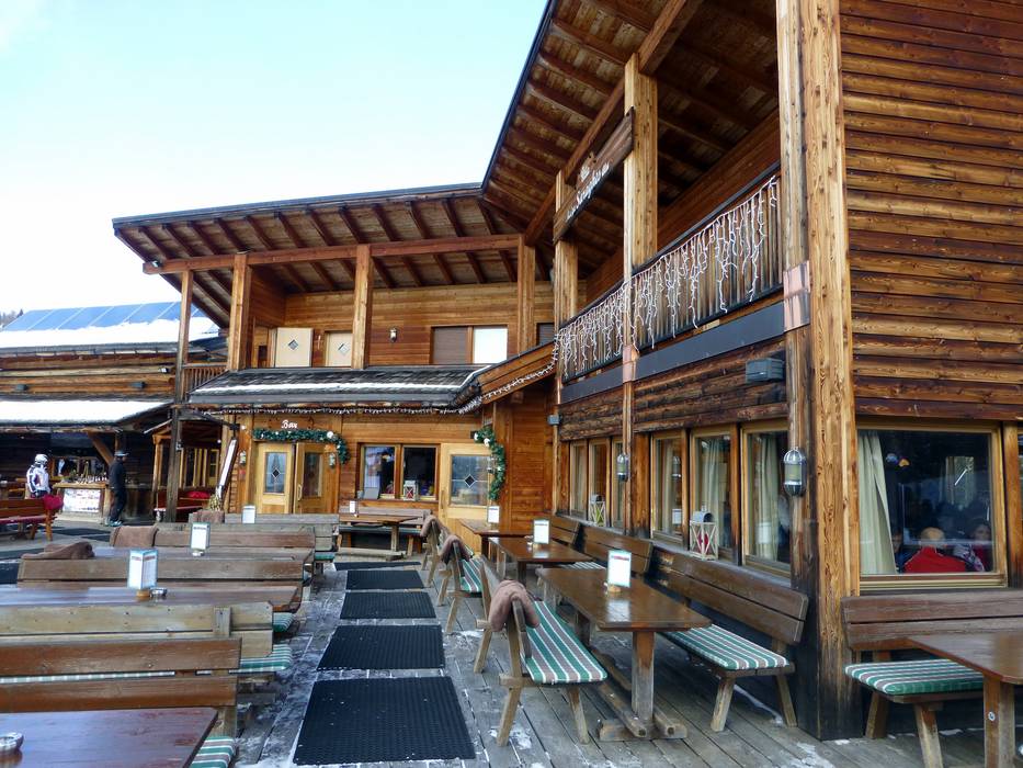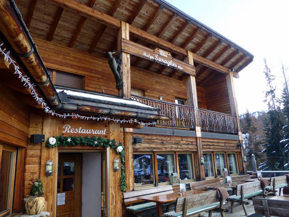 Die urige Saraghes-Hütte bietet eine gepflegte Küche mit Bedienung und eine gemütliche Sonnenterrasse mit Bar. Für die Kinder ist der hauseigene Spielplatz ein Highlight.