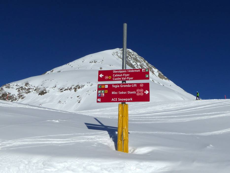 Orientierung (Pistenplan, Informationstafeln, Ausschilderung) und Sicherheit im Skigebiet Andermatt/​Oberalp/​Sedrun