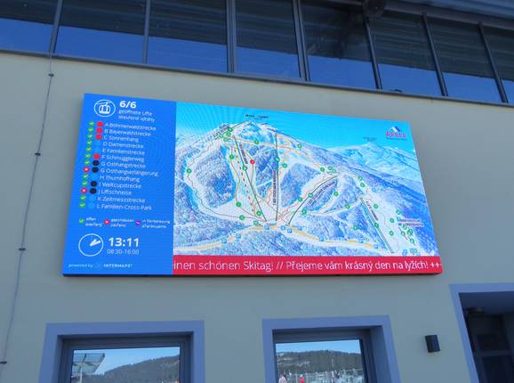 Im Skigebiet sind mehrere große Informationstafeln mit aktuellen Informationen und TV-Screens verteilt. Die Ausschilderung auf den Pisten ist gut. Positiv hervorzuheben ist auch die Ausschilderung in tschechischer Sprache, da das Skigebiet Arber nicht weit von der tschechischen Grenze liegt.