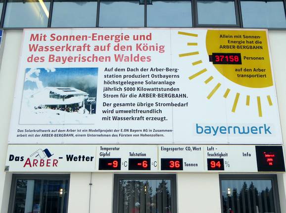 Auf dem Dach der Arber-Bergstation produziert Ostbayerns höchstgelegene Solaranlage jährlich 5000 Kilowattstunden Strom für die Arber-Bergbahn. Der gesamte übrige Strombedarf wird umweltfreundlich mit Wasserkraft erzeugt. Zudem gibt es Zapfstellen für Elektroautos am Parkplatz.