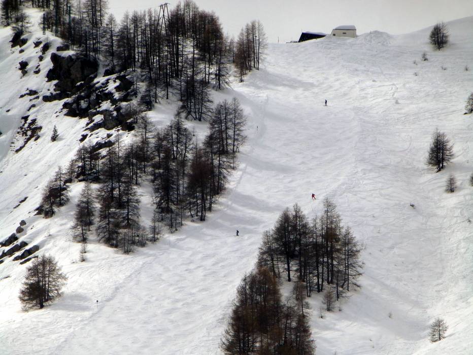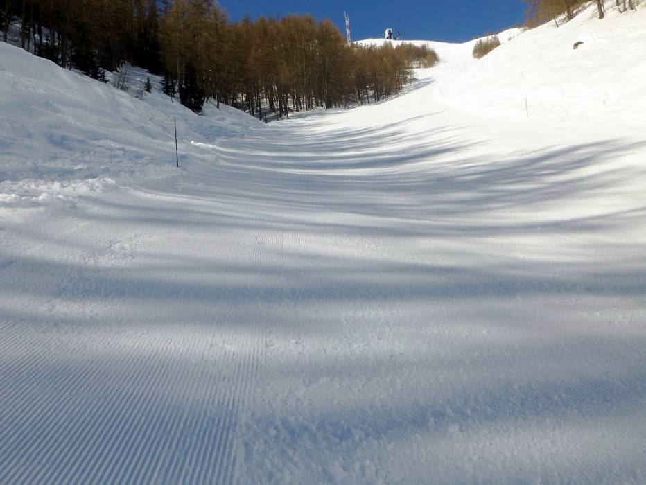 Die südlich exponierte schwarze Piste Face bietet einen guten Blick auf das Dorf Auron. Sie hat einen sehr schwierigen und langen Steilhang.