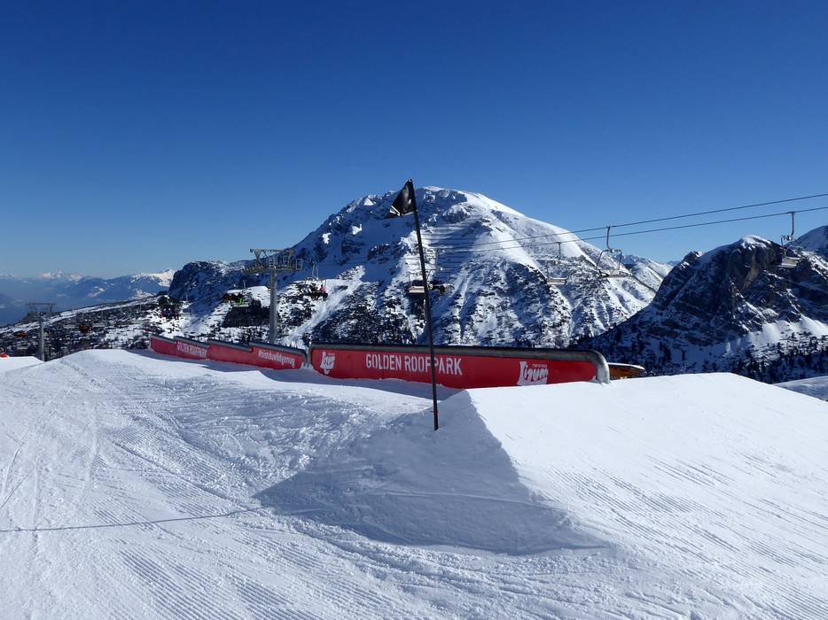 Der Golden Roofpark ist ein idealer Snowpark für jedes Level. Die Hindernisse sind mit blau, rot und schwarz markiert und die Lines reichen damit von leicht bis schwer. Der Snowpark bietet jede Menge Obstacles und einen bunten Mix an Boxen, Rails, Tubes, Jibs, Kickern und einer Wellenbahn - sowie einen tollen Blick auf Innsbruck. Der Snowpark wird täglich frisch präpariert. Der Golden Roofpark Axamer Lizum liegt an der Karleitenbahn.