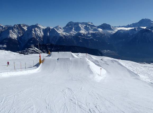 Das Skigebiet Belalp bietet einen schönen Snowpark unterhalb Hohbiel und eine Funslope unterhalb Schönbiel. Angestellte der Shape Academy präparieren die Angebote professionell.