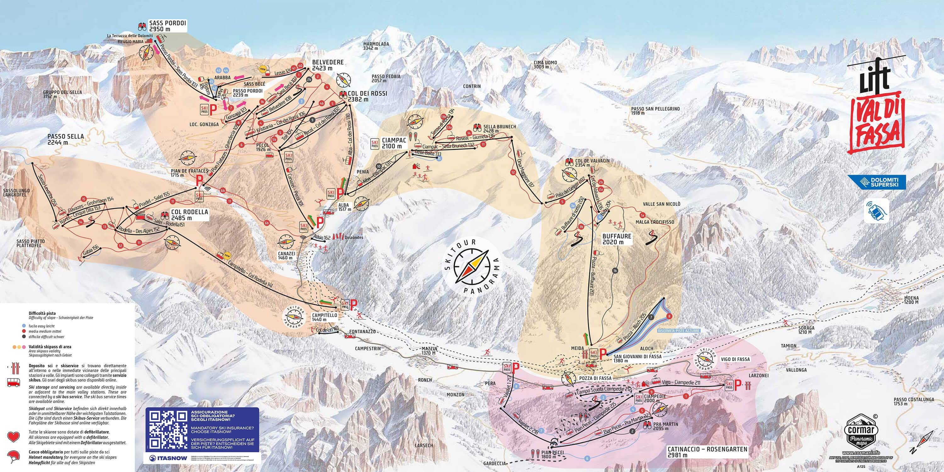 Orientierung (Pistenplan, Informationstafeln, Ausschilderung) und Sicherheit im Skigebiet Belvedere/Col Rodella/Ciampac/Buffaure – Canazei/Campitello/Alba/Pozza di Fassa