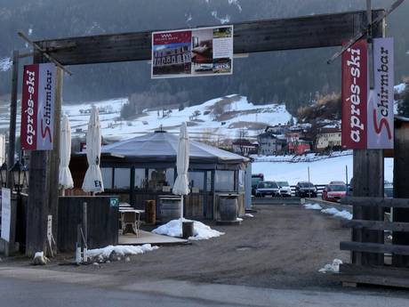 Vor der Talabfahrt kann man an der Mittelstation in die Schirmbar einkehren. Die Sonnenterrassen der Restaurants laden ebenfalls zum gemütlichen Après-Ski ein. An der Talstation wartet eine Après-Ski Schirmbar.