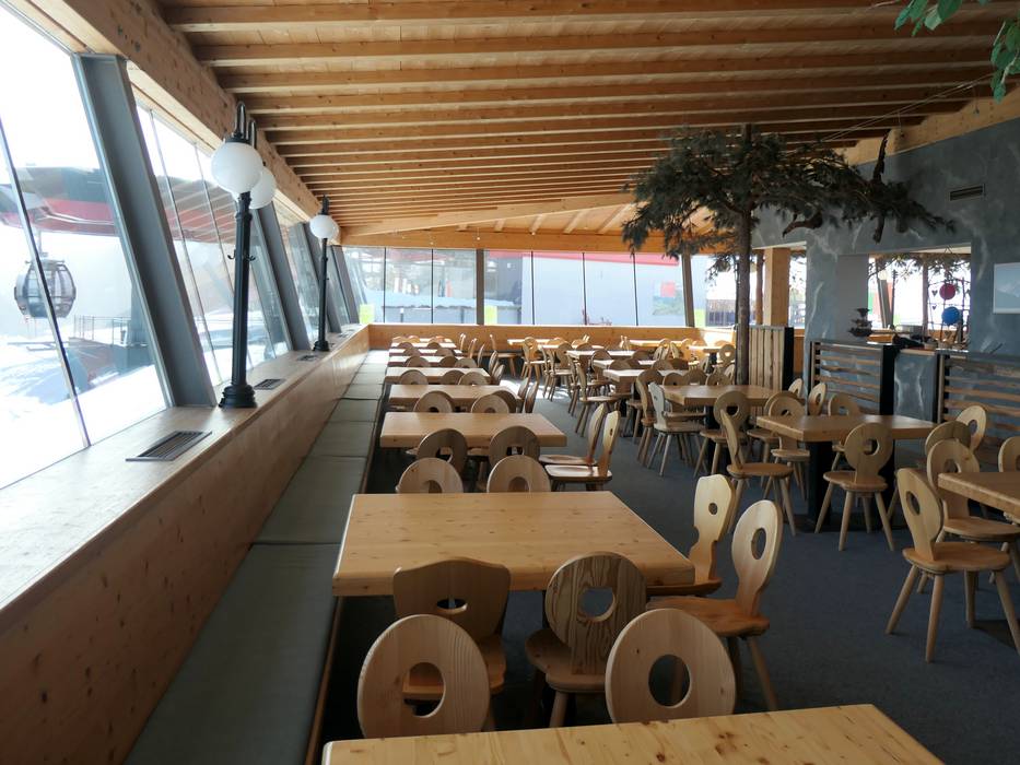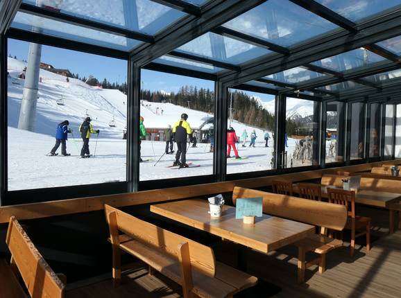 Das Bedien-Restaurant Bärentraum verwöhnt mit Tiroler Spezialitäten. Bei schönem Wetter kann das Dach geöffnet werden.