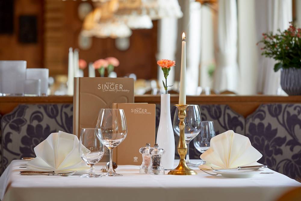 Die Gäste werden mit Singer's Verwöhnhalbpension kulinarisch rundherum verwöhnt. Das ausgiebige Frühstücksbuffet lockt mit saisonalen und regionalen Produkten. Das 5-gängige Gourmet-Abendmenü mit täglichm Salat- und Käsebuffet lässt keine Wünsche offen. Der professionelle Service begrüßt die Gäste mit Namen und liest jeden Wunsch von den Augen ab. Im SPA-Bistro (Bademantelzone) und in der S-Lounge kann man den ganzen Tag über Snacks und Getränke genießen.
