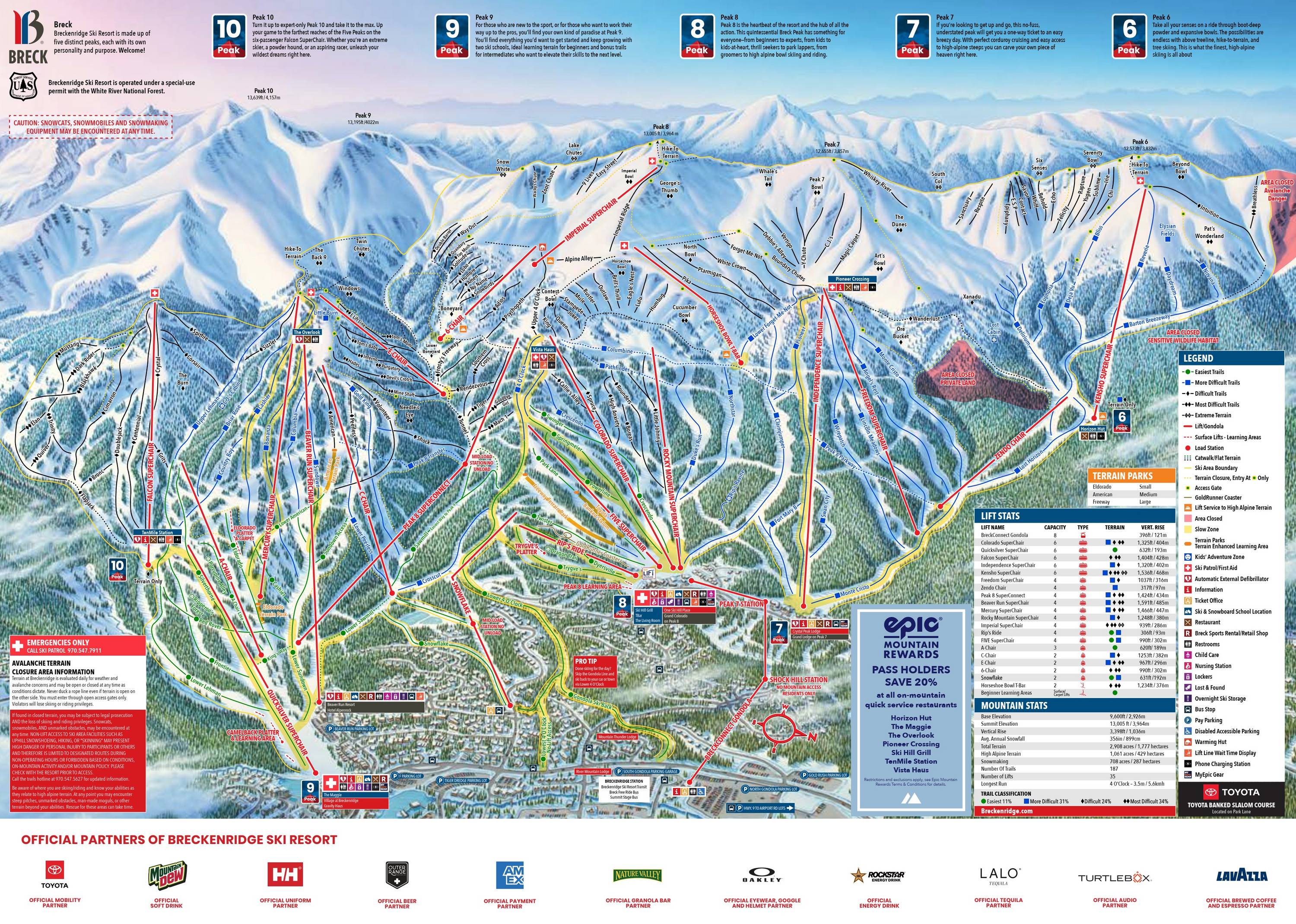 Der Pistenplan bildet das gesamte Skigebiet sehr gut ab. Auf der Rückseite findet man einen Detailplan vom Peak 9 North Slopes. Es sind alle Lifte und Pisten mit Detailinformationen eingezeichnet. Man findet zusätzliche Informationen zur Skischule, Aktivitäten, Restaurants, Parkplätze und alle wichtigen Telefonnummern auf dem Pistenplan. Alle Berge sind mit Höhenangaben. Weitere Höhenangaben bei den Bergstationen der Lifte wären noch hilfreich.