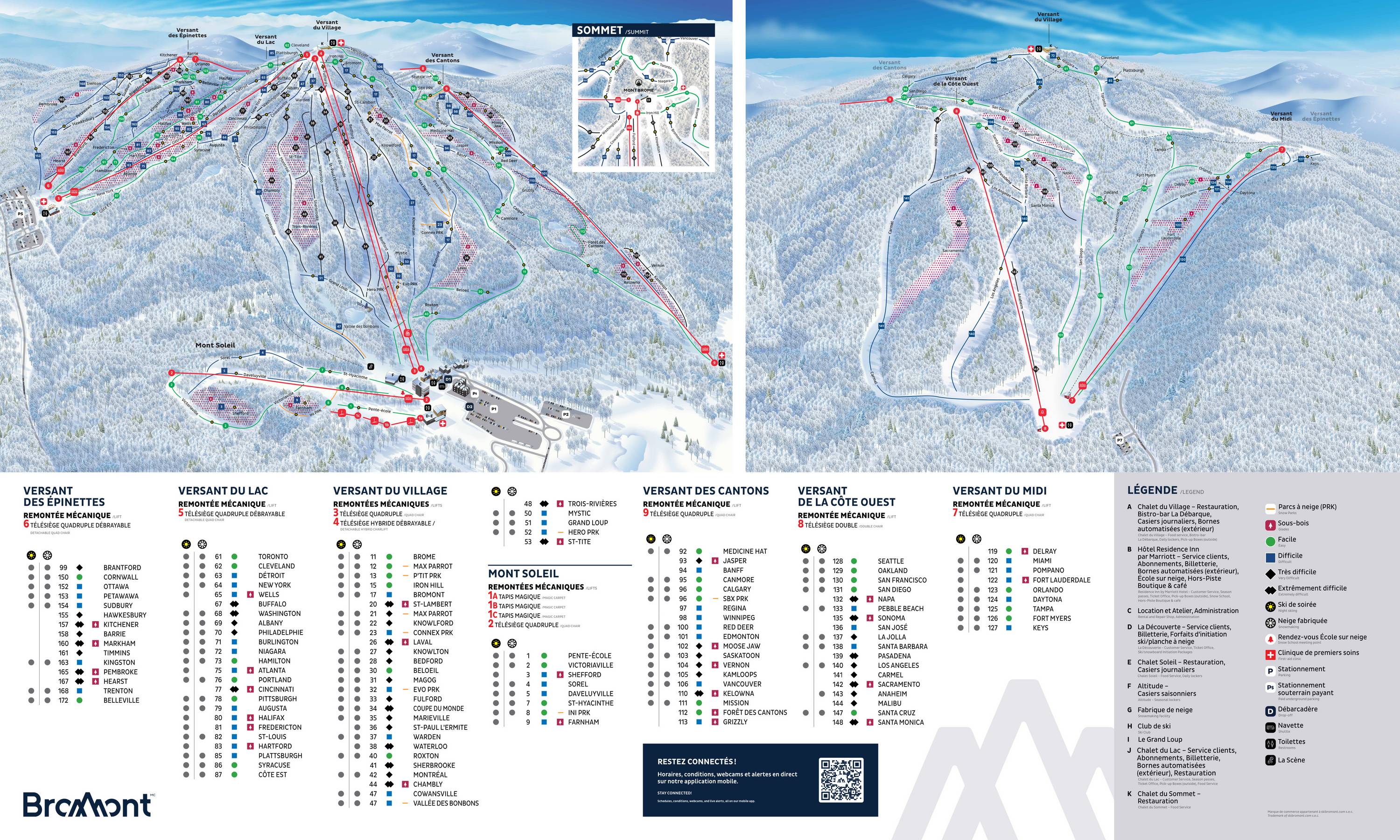 Der Pistenplan ist auf zwei Seiten aufgeteilt und stellt das Skigebiet Bromont sehr gut dar. Es sind alle Lifte und Pisten eingezeichnet und gut beschrieben. Alle Einkehrmöglichkeiten, Parkplätze und die einzelnen Snowparks sind ebenfalls mit angegeben.
