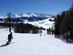 Mit dem Moosalp-Express in den oberen Teil des… Blick auf die schweren und mittelschweren Pisten… Skifahren mit Traum-Panorama am Unterrat