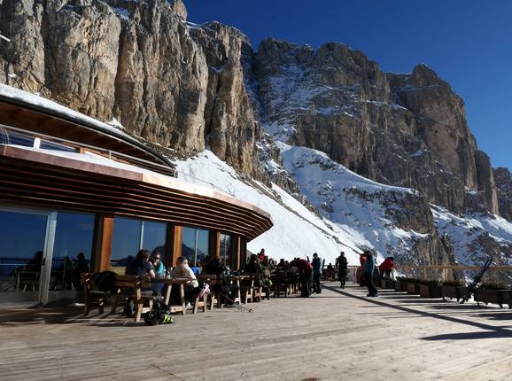 Am höchsten Punkt im Skigebiet auf 2337 m befindet sich die Laurins Lounge mit bestem Blick über die Dolomiten. Die exklusive Lounge bietet eine Sonnenterrasse, gutes Essen und ausgewählte Weine. Die ideale Location für genüssliche Stunden.