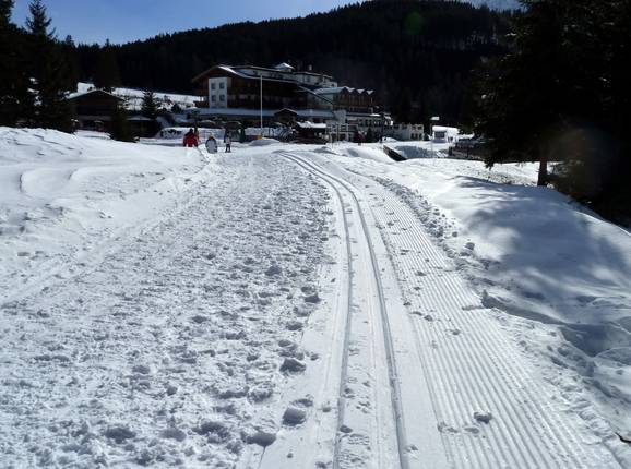Im Skigebiet Carezza gibt es drei verschiedene Loipen vor der beeindruckenden Kulisse des Rosengartens. Hervorzuheben sind die Rundkurse Frin (Tscheinerhütte/Moseralm) und Karersee.