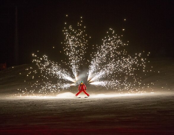 Die ultimative Demo-Show am Karerpass auf der Pra di Tori Piste in Carezza versetzt Groß und Klein ins Staunen: mit König Laurin und den 7 Zwergen, Fackelabfahrt, Freestyle-, Telemark- und Schneekatzenshow, Vorführung der Skischule Carezza und Feuerwerk.
