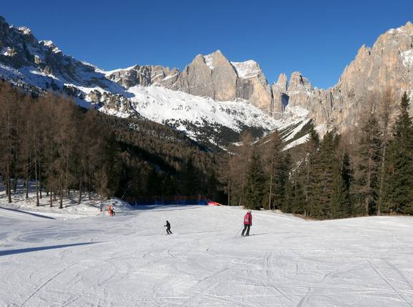 Von Prà Martin, dem höchsten Punkt im Skigebiet, über die leichten Pisten Cigoloade, Vajolet 2 und 1 bis zur Talstation nach Pera di Fassa - Talabfahrt Thöni nach Vigo di Fassa · Länge 4,5 km · Höhenunterschied 676 m