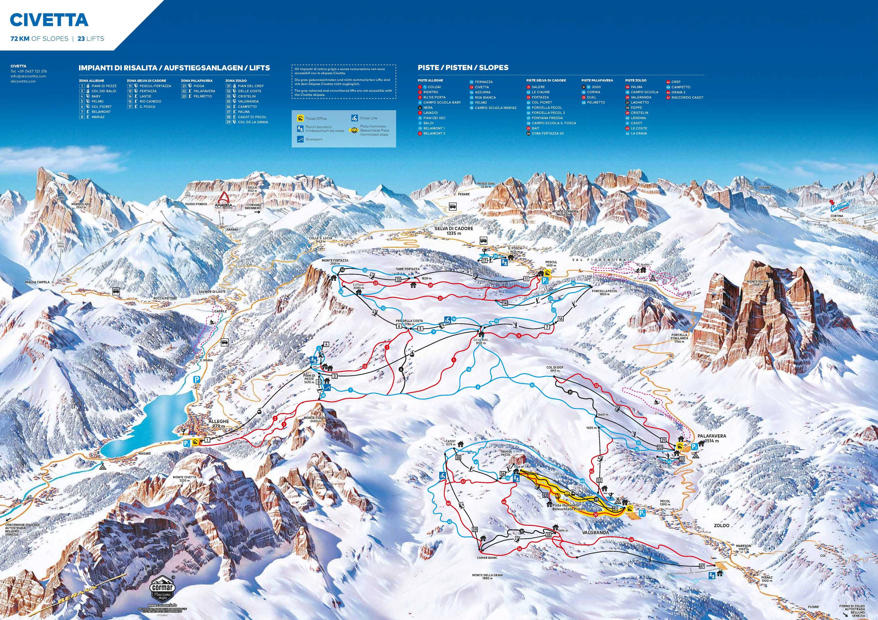 Der Pistenplan bildet das Skigebiet Civetta sehr gut ab. Die Pisten und Lifte sind klar beschrieben. Wichtige Informationen wie Höhenangaben, Einkehrmöglichkeiten und weitere Angebote sind deutlich eingezeichnet.