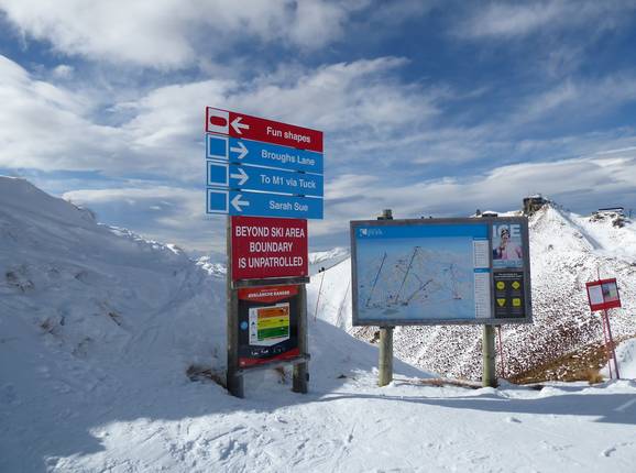 Orientierung (Pistenplan, Informationstafeln, Ausschilderung) und Sicherheit im Skigebiet Coronet Peak