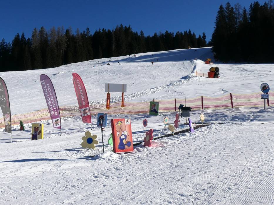 Das Bärencamp befindet sich in der Nähe der Talstation der Russbacher Hornbahn. Auf der Bärenwiese mit Zauberteppich und Tellerliften fällt das Skifahren leicht. Bruno der Skibär besucht auch hin und wieder die Kinder und fährt eine Runde mit Ski.