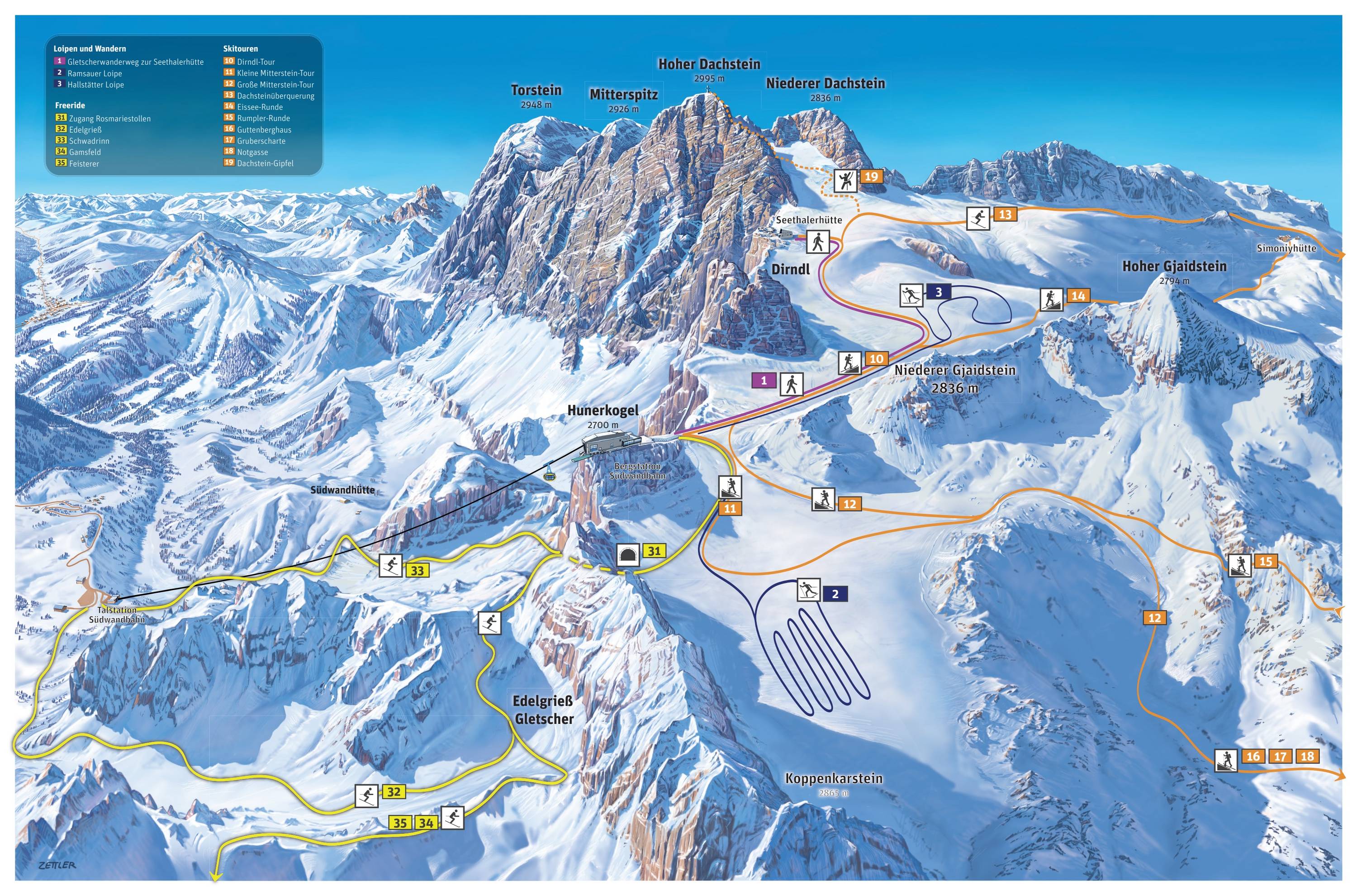 Es gibt für den Dachsteingletscher keinen eigenen Pistenplan als Faltblatt. Das Gletscherskigebiet ist bei den Pistenplänen der nahegelegenen 4-Berge-Skischaukel Schladming integriert. Auf diesem sind die Lifte und Pisten sowie ergänzende Symbole für Langlauf und Snowpark gut vermerkt.