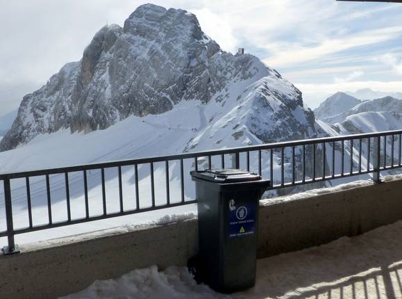 Um den Gletscher vor Unrat zu schützen, sind rund um die Bergstation zahlreiche Abfallbehälter aufgestellt. Die sanitären Anlagen sind zudem in geplegtem Zustand vorzufinden.