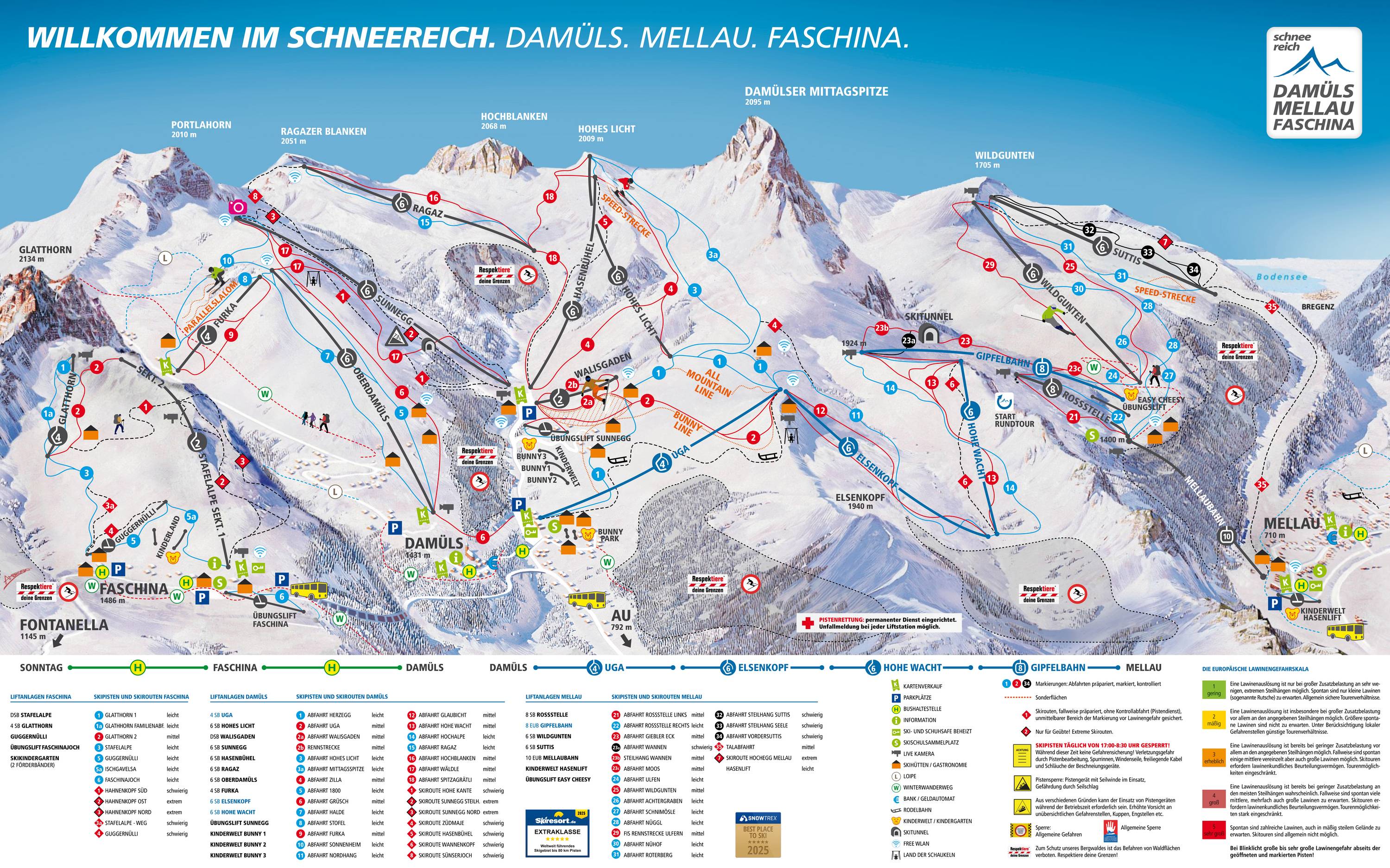 Der Pistenplan von Damüls Mellau ist übersichtlich und leicht verständlich. Es ist jede Piste und jeder Lift mit Namen angegeben. Auf der Rückseite findet man die Fahrpläne der Skibusse und Kontaktdaten der Einkehrmöglichkeiten. Die Liftsymbole bzw. Beschreibungen könnten aber noch deutlicher sein.