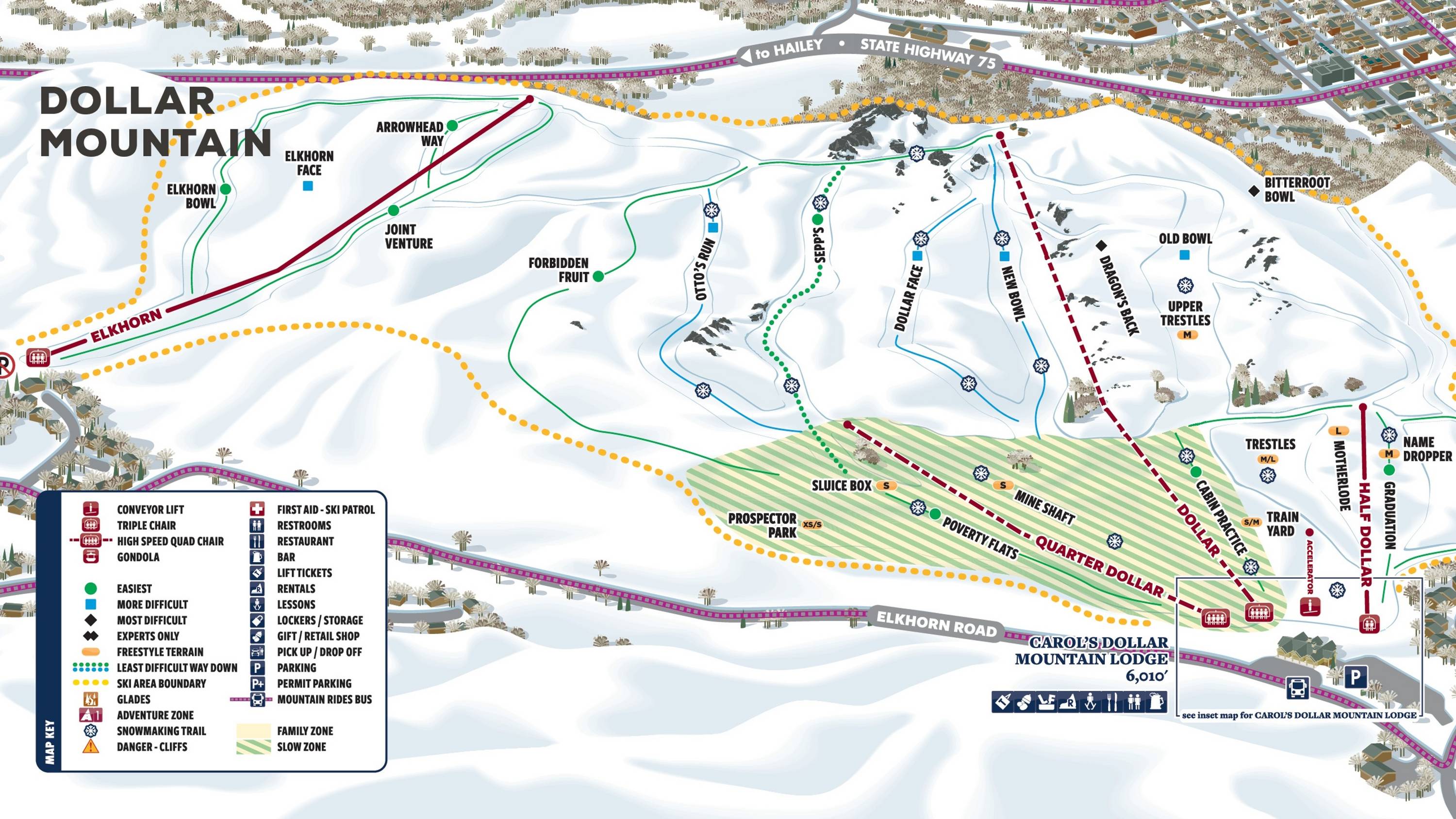 Der Pistenplan stellt das Skigebiet Dollar Mountain gut dar. Alle Pisten und Lifte sind eingezeichnet. Auf der Rückseite ist der Plan vom Skigebiet Bald Mountain aufgenommen. Weiterführende Informationen zu den Einkehrmöglichkeiten, Skischule, Skiverleih, Freestyle Terrain Zones und zu den Loipen sind ebenfalls vorhanden. Die Sun Valley App bietet auch Echtzeitinformationen zum Skibetrieb.
