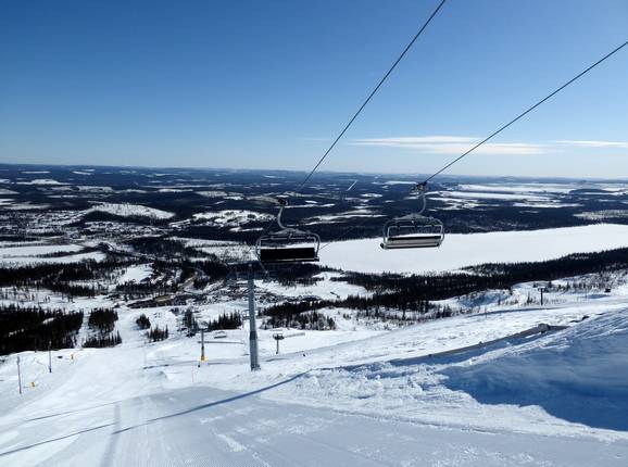Der Snowpark im Skigebiet Dundret Lapland Breite Pisten starten am Gipfel Breite Piste Nr. 4 zur Talstation Blick vom Dundret auf den See Harrträsket