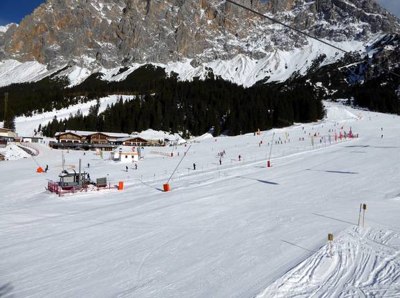 Die Ehrwalder Alm ist ideal für Anfänger. Sie schätzen die zahlreichen leichten Pisten und die einfache Talabfahrt. Das gesamte Skigebiet lässt sich auf sanften Abfahrten erkunden, ohne Schlepplifte nutzen zu müssen. An der Bergstation der Gondelbahn befindet sich ein großes Anfänger- und Skischulgelände, perfekt zum Üben.