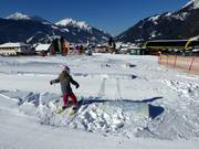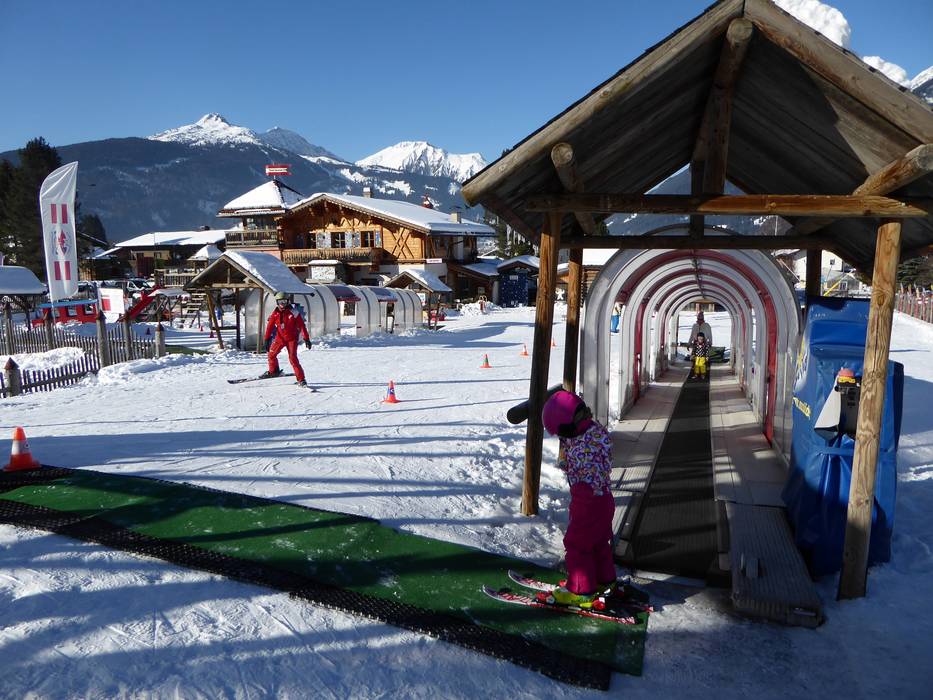 Das Kinderland der Skischule Total befindet sich an der Talstation des Sonnenhang Sunracers. Kindern lernen am Zauberteppich (Förderband).