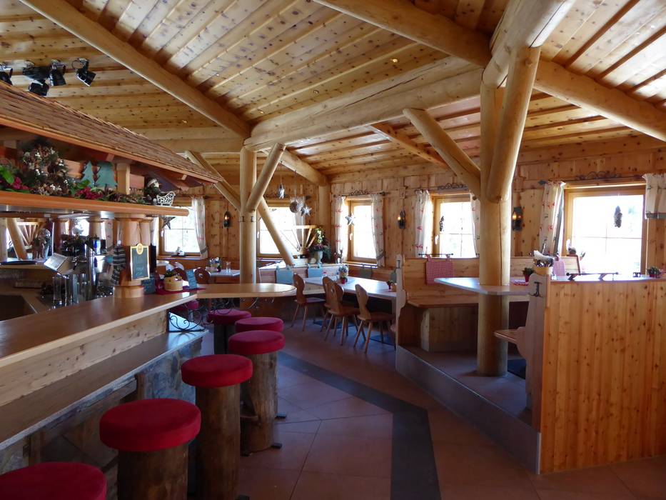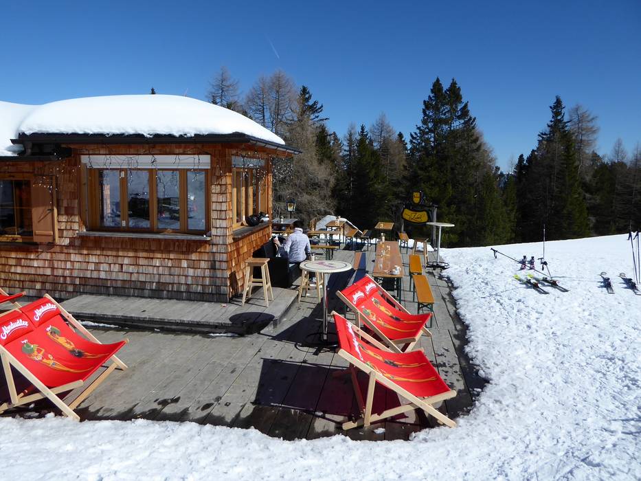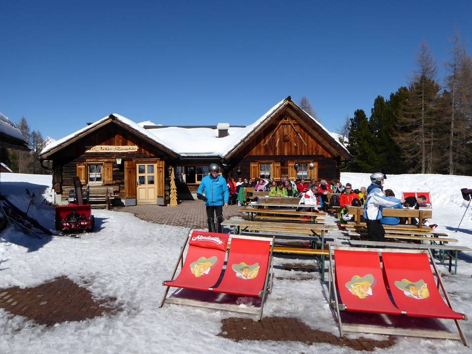 Die Zirmbar ist eine gemütlich-rustikale Hütte mit einer großen Sonnenterrasse. Regionale Köstlichkeiten sowie Kaffee und Kuchen werden serviert.