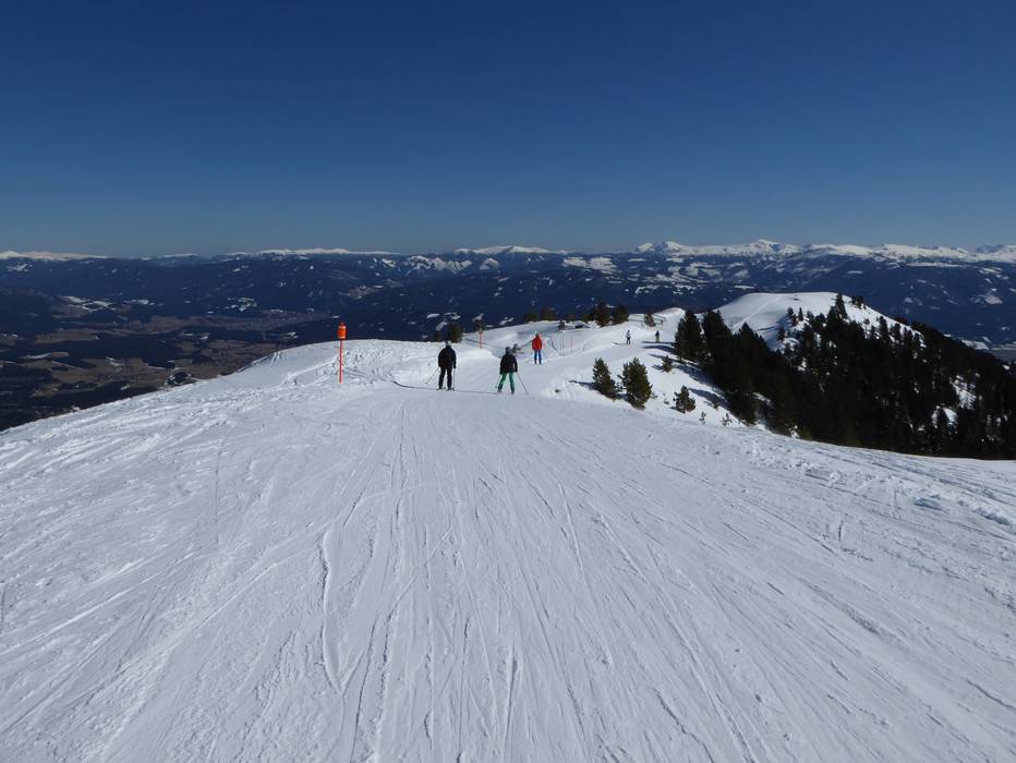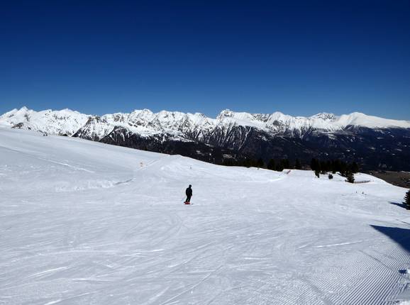 Die Piste führt von der Bergstation des Zirbenjets über den Höhen-Schiweg zur Bergstation der Samsonbahn und dann über die Moserkopfabfahrt zur Talstation.