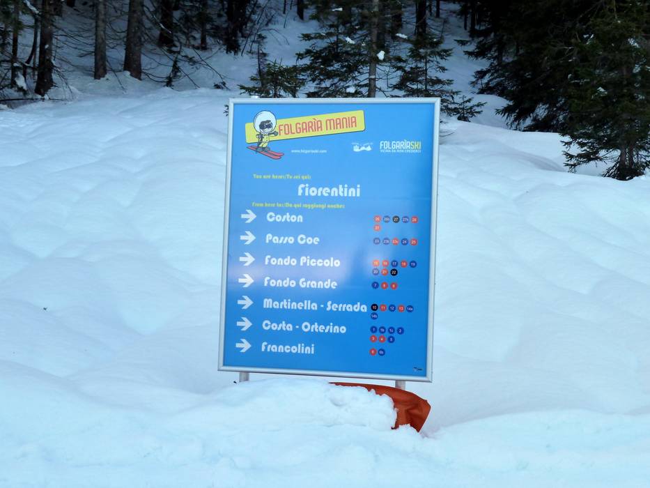 Man findet sich im Skigebiet von Folgaria-Fiorentini sehr gut zurecht. Alle Pisten sind ausgeschildert und an den wichtigen Abzweigungen sind zu den Schildern auch noch Pistenpläne mit aufgestellt.