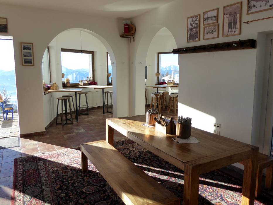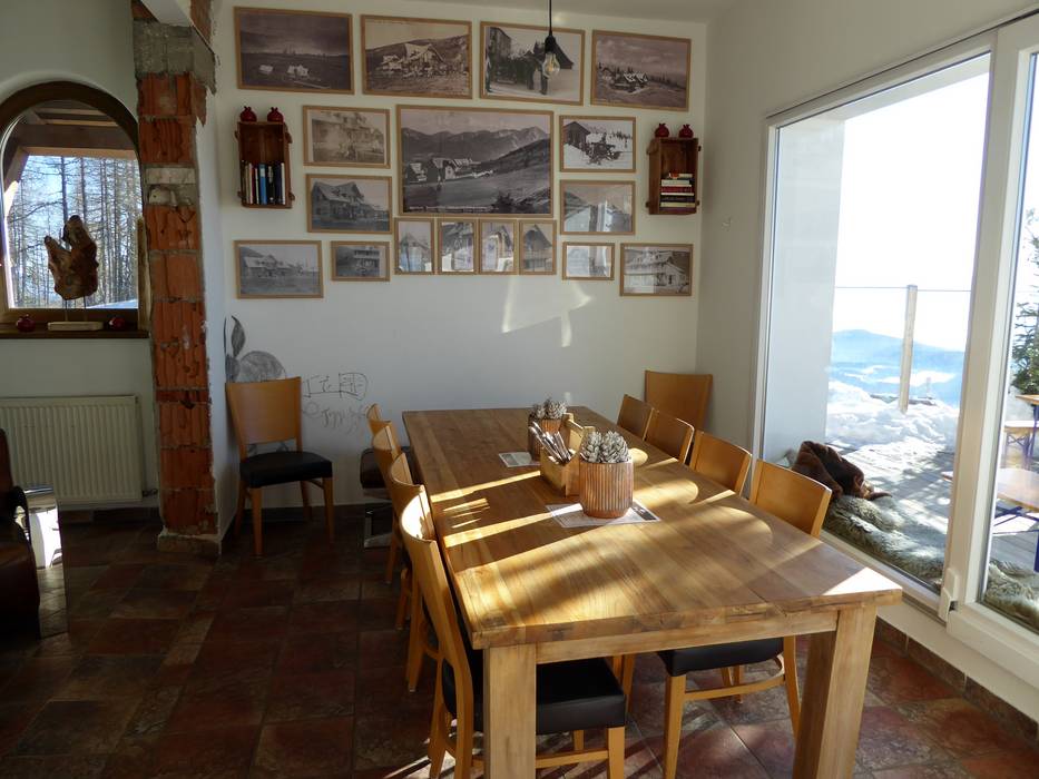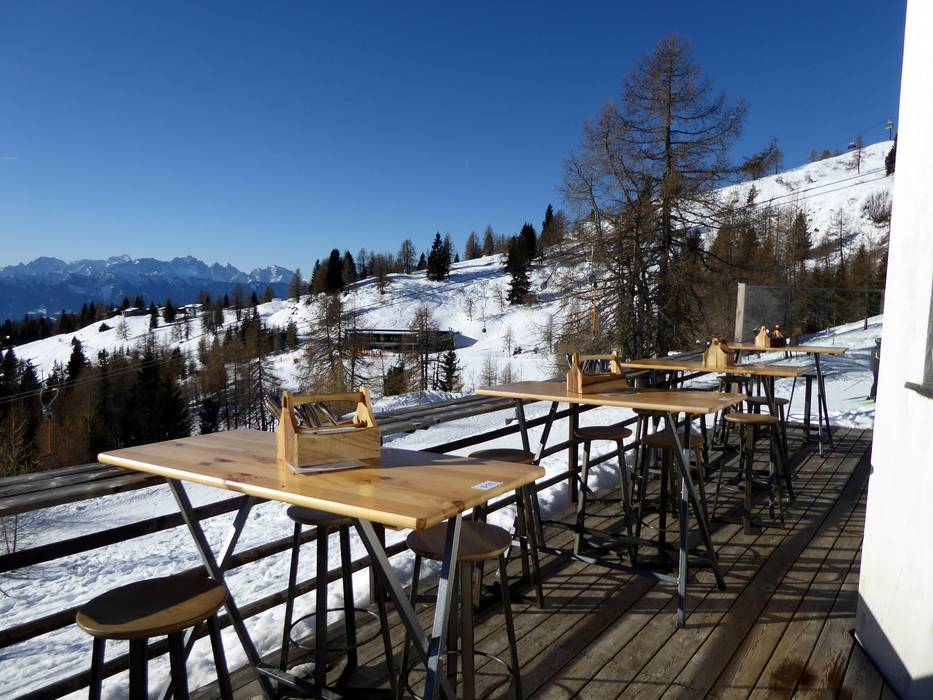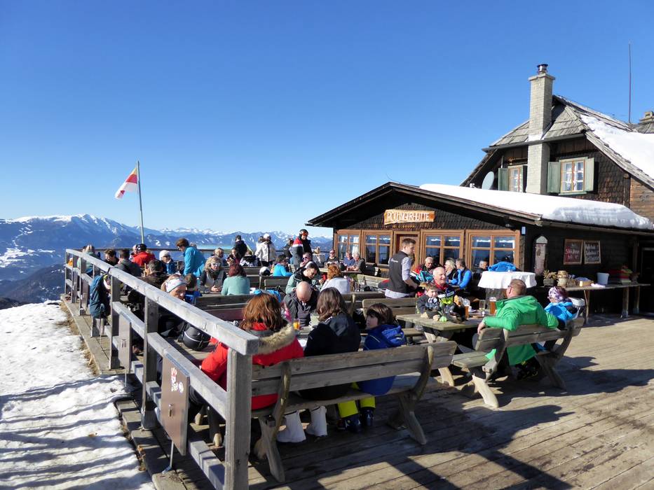 An der Bergstation des Skigebiets ist der Panoramarundblick einzigartig. Es wird Kärntner Küche mit Selbstbedienung angeboten.