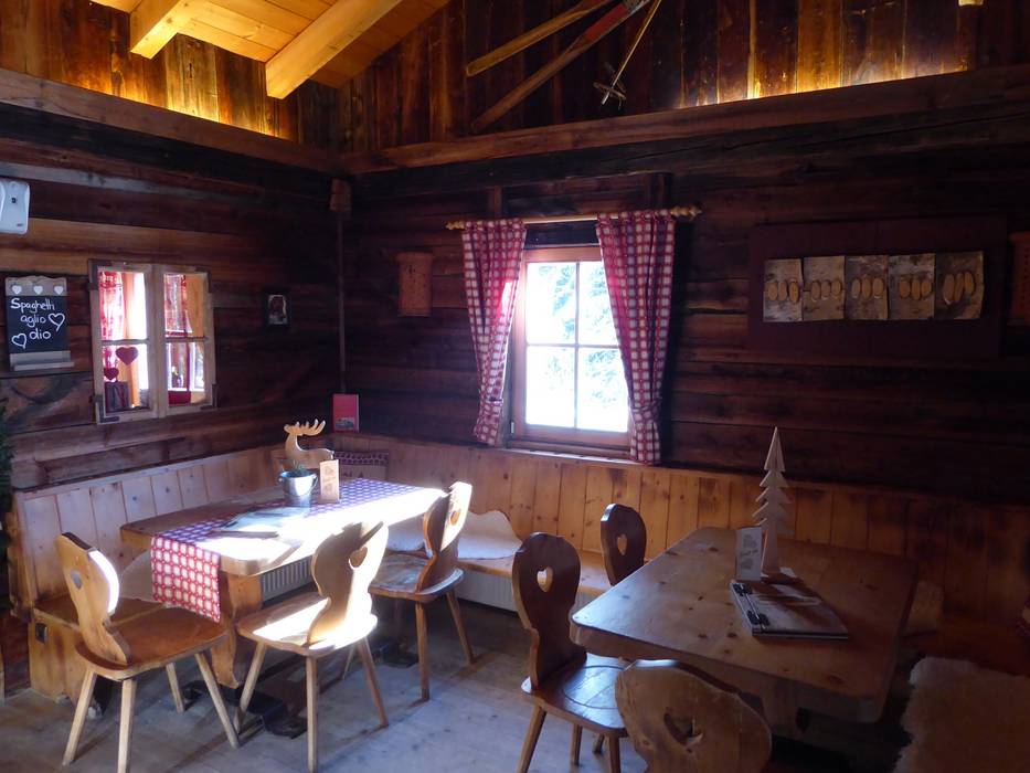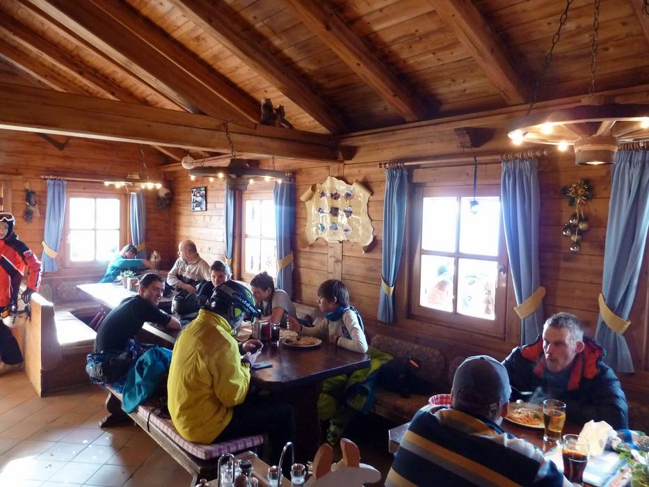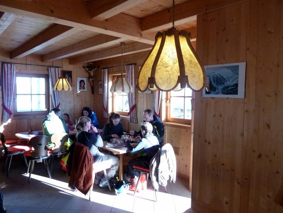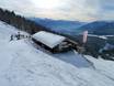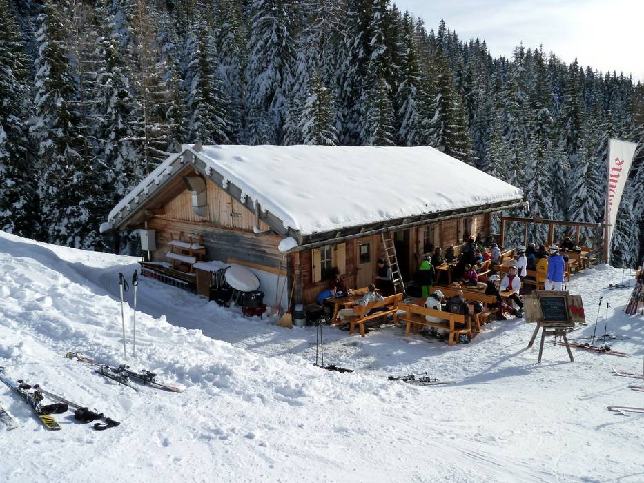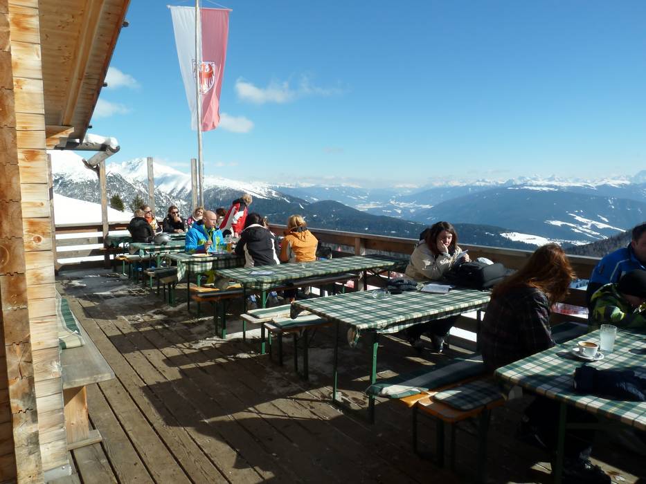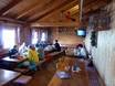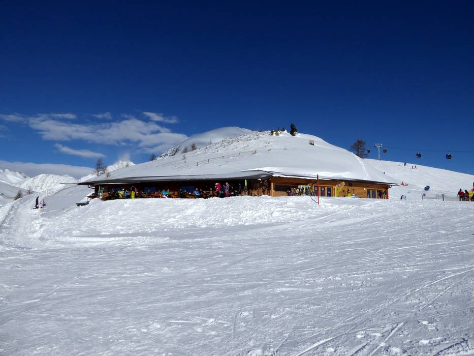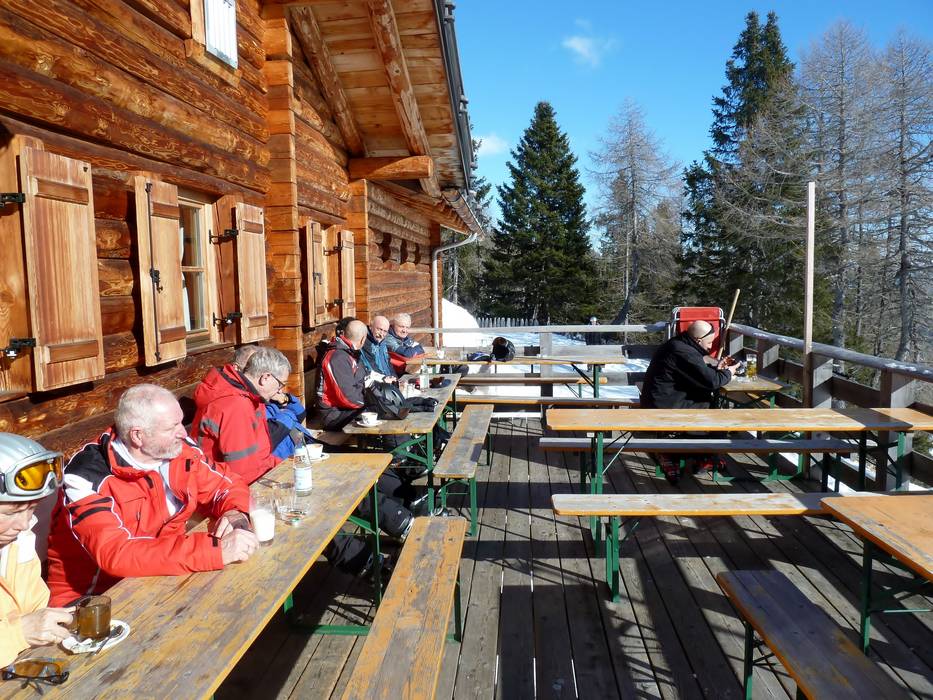 Kleine Skihütte mit schöner Aussicht auf der Sonnenterrasse. Typische regionale Gerichte stehen auf der Speisekarte.
