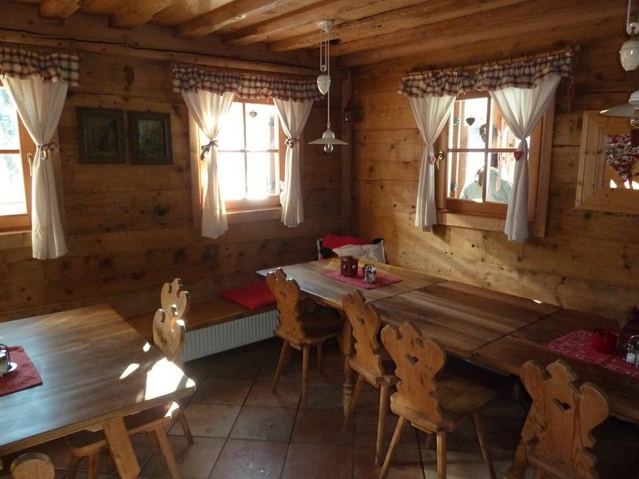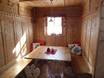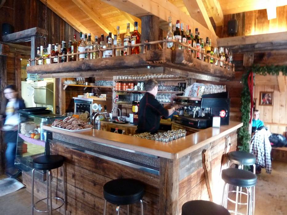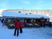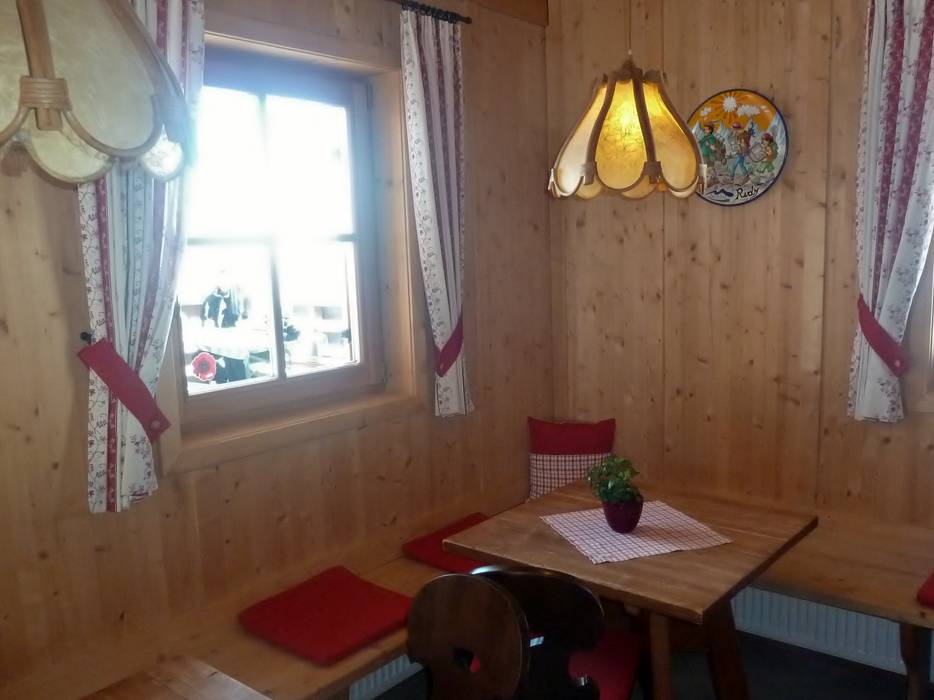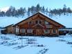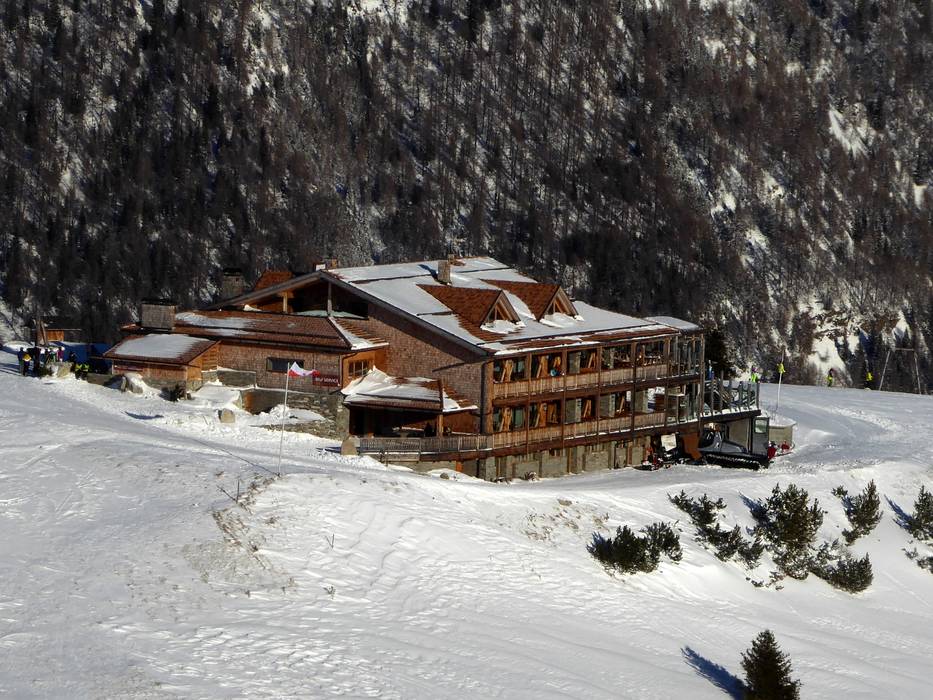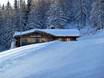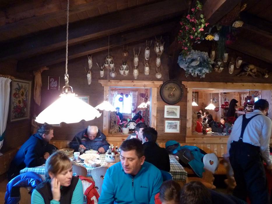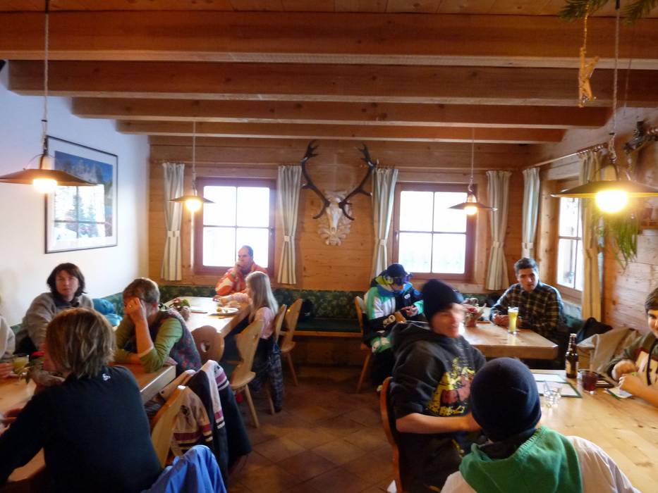 Kleine Skihütte mit schöner Aussicht auf der Sonnenterrasse. Typische regionale Gerichte stehen auf der Speisekarte.