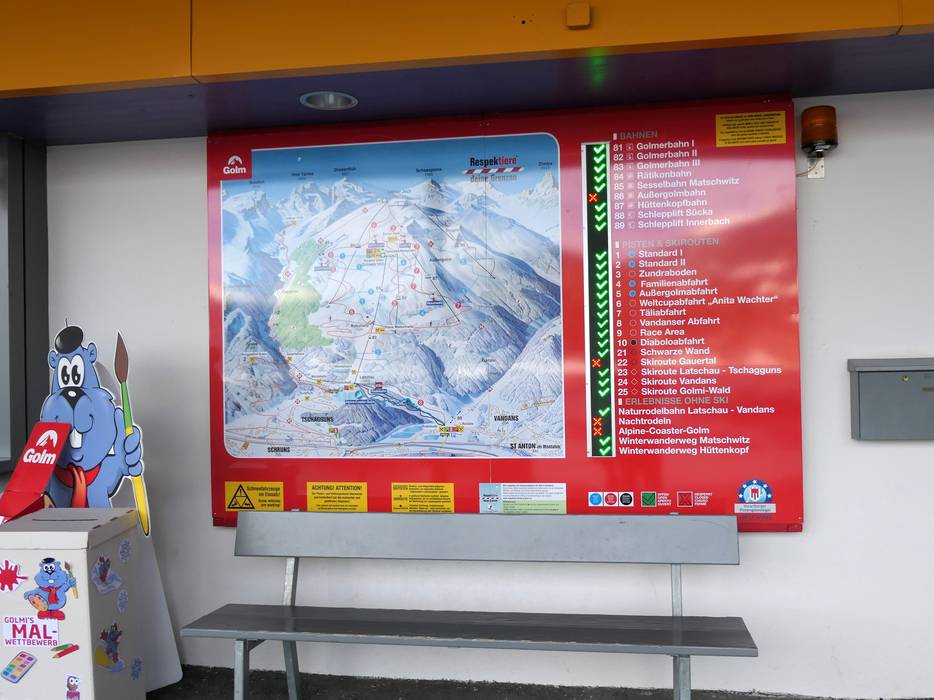 Das Skigebiet Golm setzt auf ein ausgeklügeltes Pistenleitsystem. Man findet viele gewohnte Elemente wie die Pistennummern in blau, rot und schwarz, aber auch viel Weiteres. Ein Blick auf die Wegweiser zeigt nicht nur wohin die jeweilige Piste führt, sondern auch welche Einrichtungen auf dem Weg liegen. Bei den Bahnen, die an dieser Piste liegen, wird die Art der Bahn gezeigt. So kann man sich einfacher und schneller orientieren und die vielfältigen Möglichkeiten des Golms nutzen. Ergänzend dazu findet man bei wichtigen Punkten Informationstafeln, die den aktuellen Pisten- und Liftstatus zeigen. Alle Pisten sind vorbildlich mit Pistennummern markiert und die Bahnen haben Überkopftafeln.
