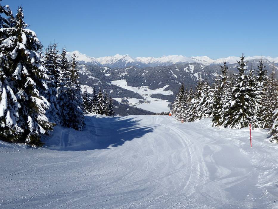Eine sehr breite Piste führt entlang der Sesselbahn zu Tale. Sie ist perfekt zum Carven geeignet.