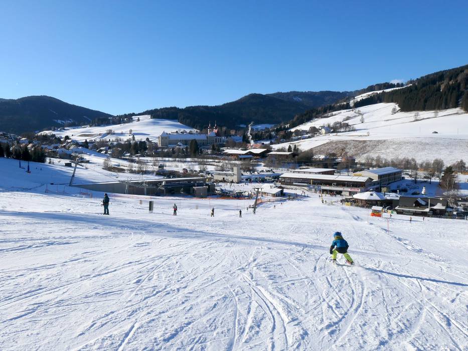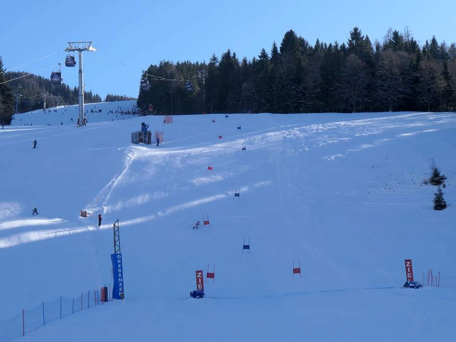 Vom höchsten Punkt des Skigebiets auf 1870 m führen durchgehende Pisten direkt bis zur Talstation (Grebe-Abfahrt, vorbei am Almgasthof Grebenzenhaus und Piste Maria Schönanger).
