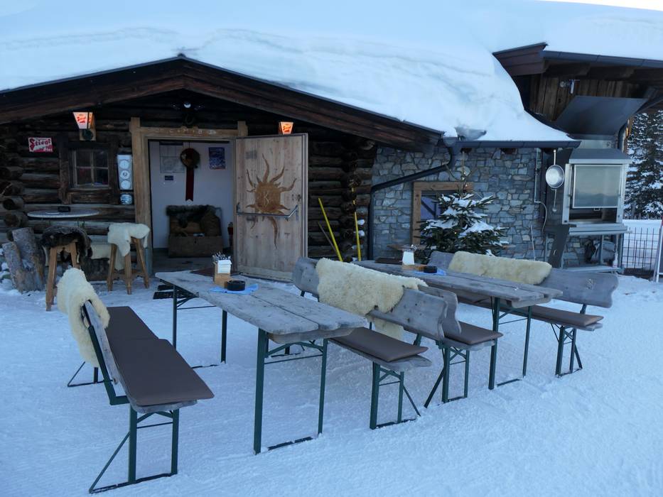 Die urige Jagahütte bietet neben einem stilvollen Ambiente auch eine Sonnenterrasse.