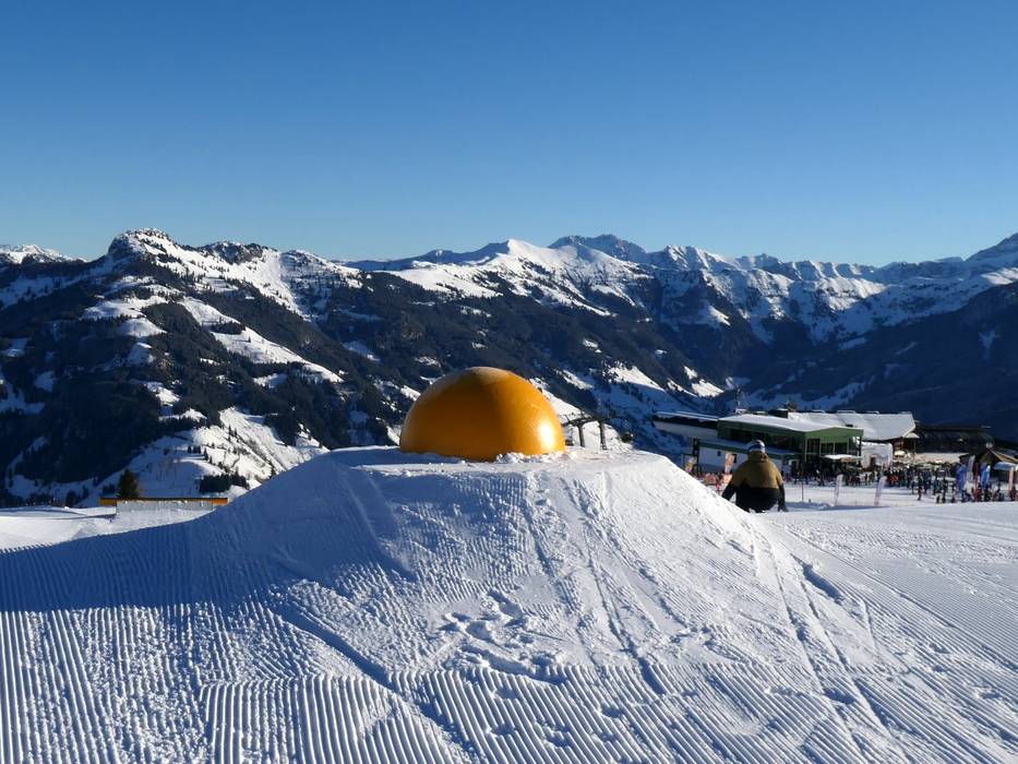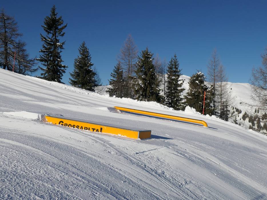 Der Snowpark beginnt an der Bergstation der Sonnenbahn. Er bietet Kicker, Boxen und zahlreiche weitere Hindernisse.