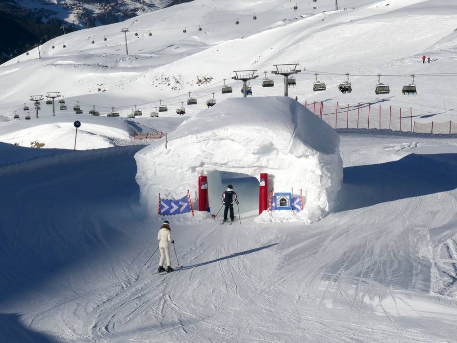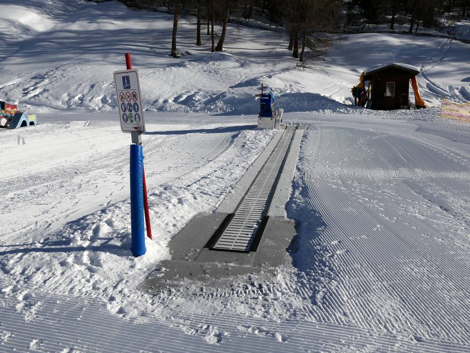 An einem überdachten Förderband in Hochgurgl können Kinder ideal die ersten Versuche auf Ski starten.