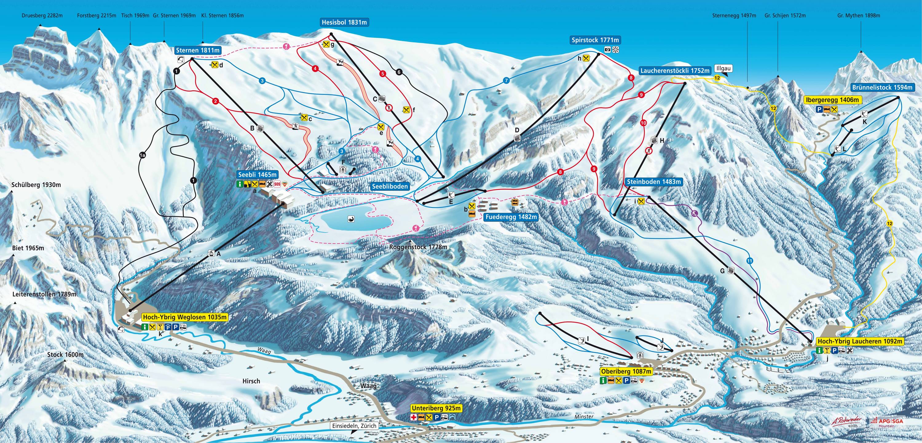 An den Talstationen und in Seebli findet man Pistenpläne und aktuelle Informationen zum Betriebsstatus. Die Skipisten sind alle sehr gut ausgeschildert. Somit findet man sich im Skigebiet von Hoch-Ybrig sehr gut zurecht.
