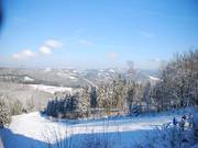 Blick von der Aussichtsterrasse auf die obere… Herrlich breit – Piste an der Hohen Bracht