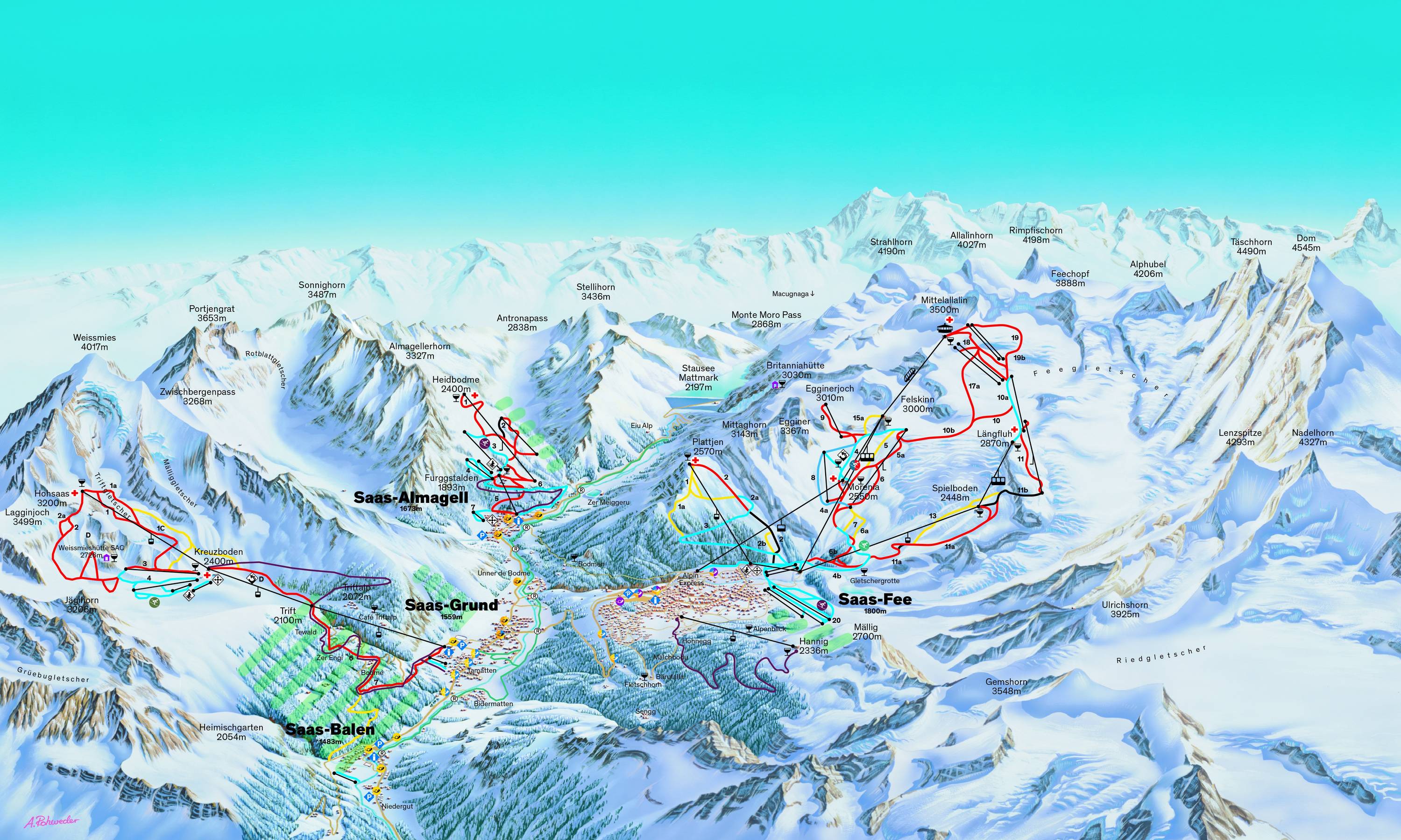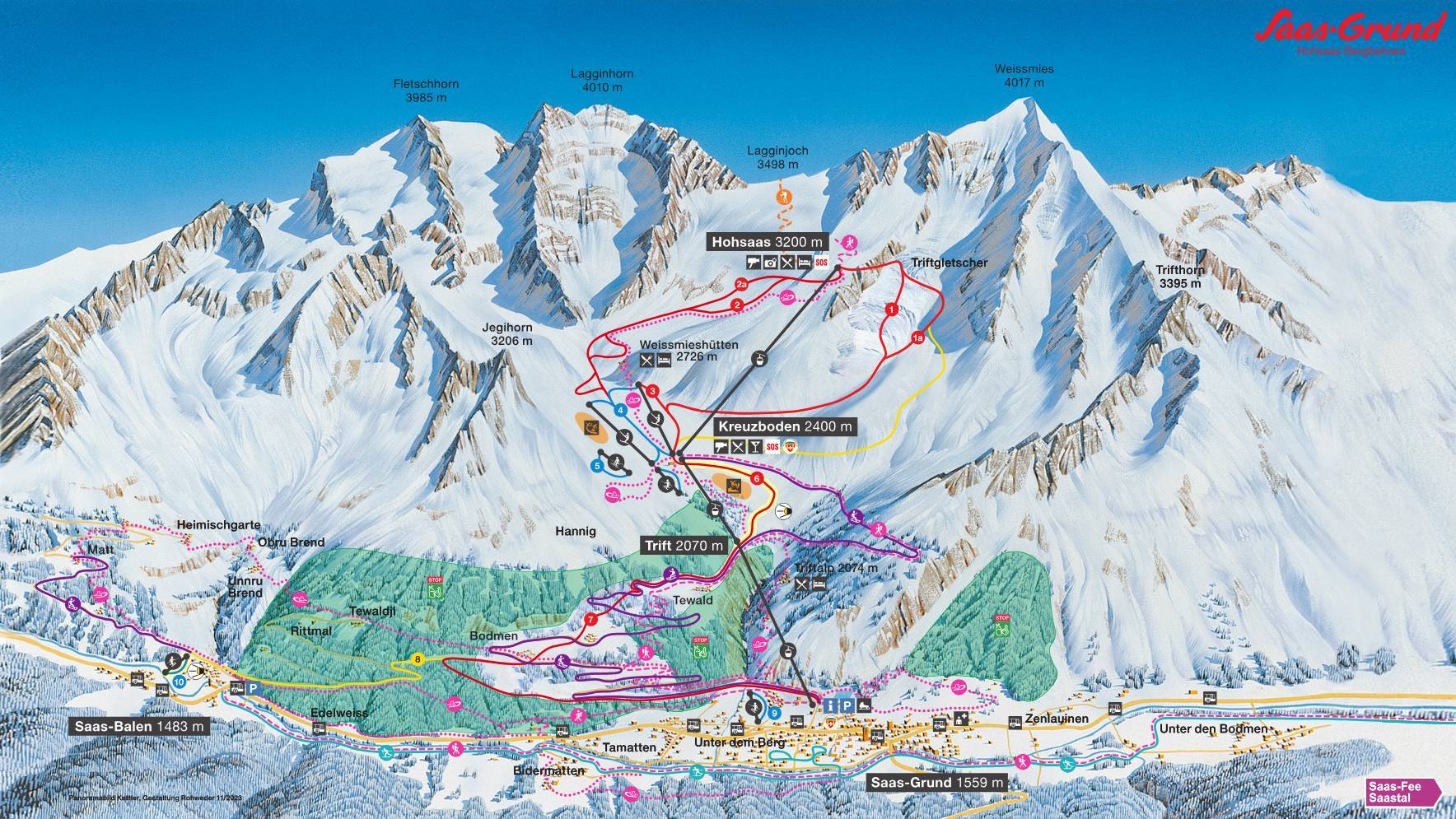Orientierung (Pistenplan, Informationstafeln, Ausschilderung) und Sicherheit im Skigebiet Hohsaas – Saas-Grund