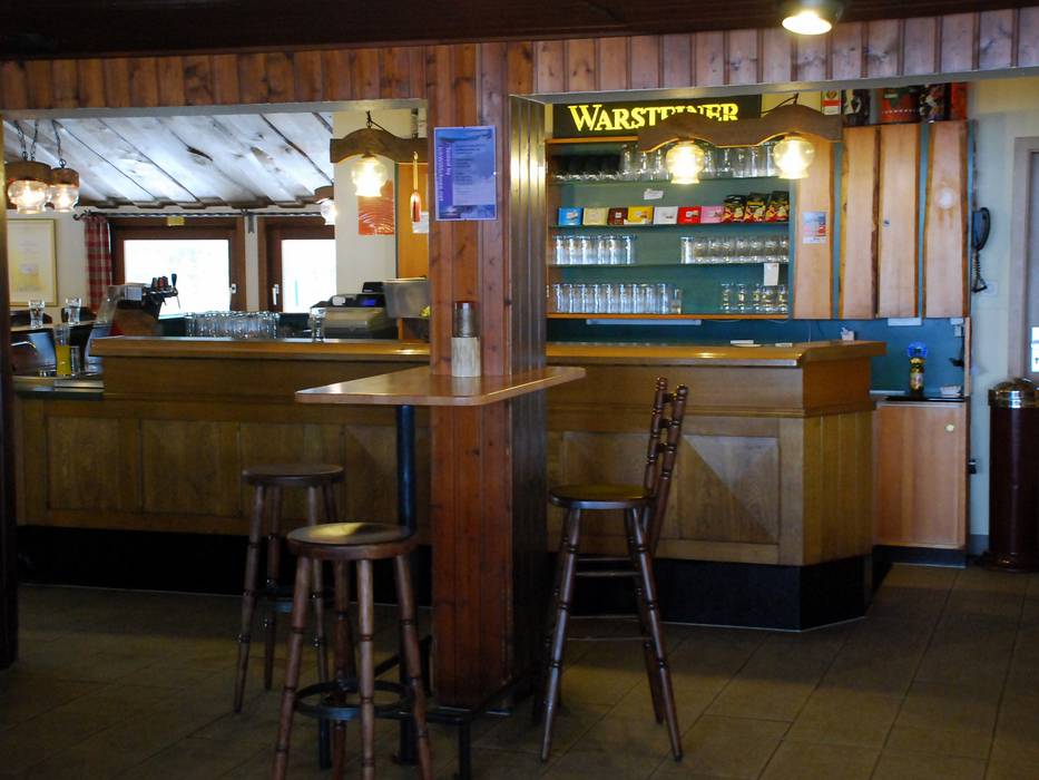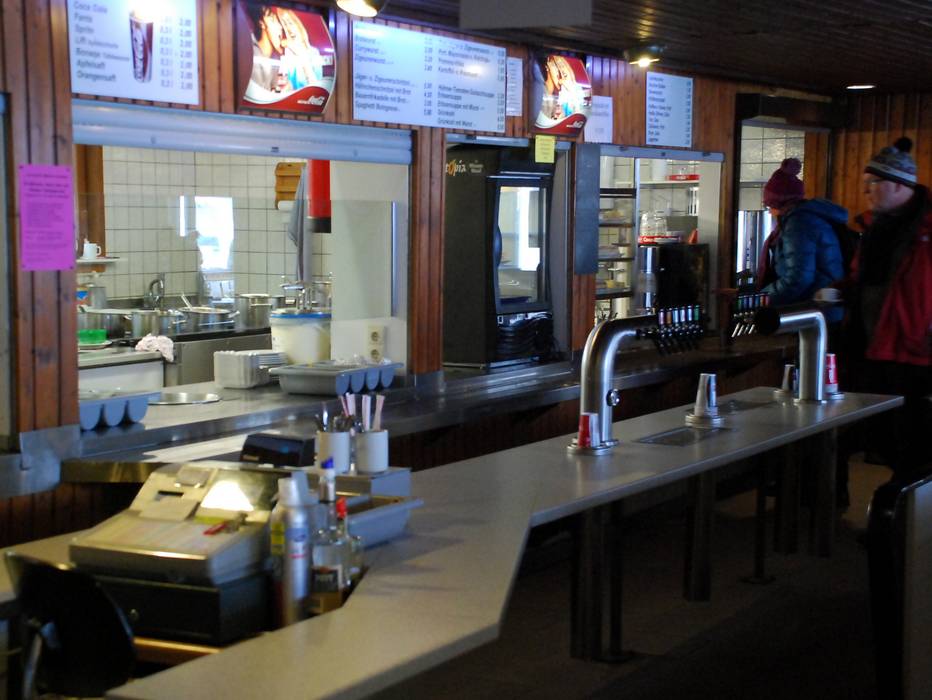 Rustikal eingerichtet, offener Kamin, deftige Hausmannskost (Wurst, Schnitzel, Grünkohl, Suppen, Pommes, Kartoffelsalat) und Kuchen, u.a. auch den leckeren Hüttenstrudel, an der SB-Theke, separate Getränketheke.