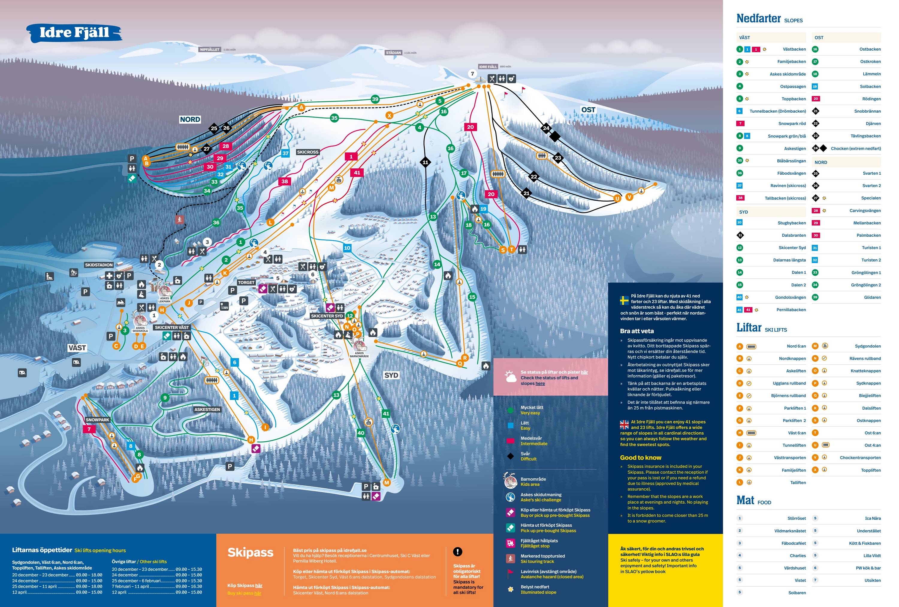 Der Pistenplan stellt das komplette Skigebiet von Idre Fjäll sehr gut dar. Es sind alle Lifte und Pisten aufgenommen. Einkehrmöglichkeiten, Feuerstellen und Toiletten sind ebenfalls mit eingezeichnet. Wünschenswert wären noch einige Höhenangaben.