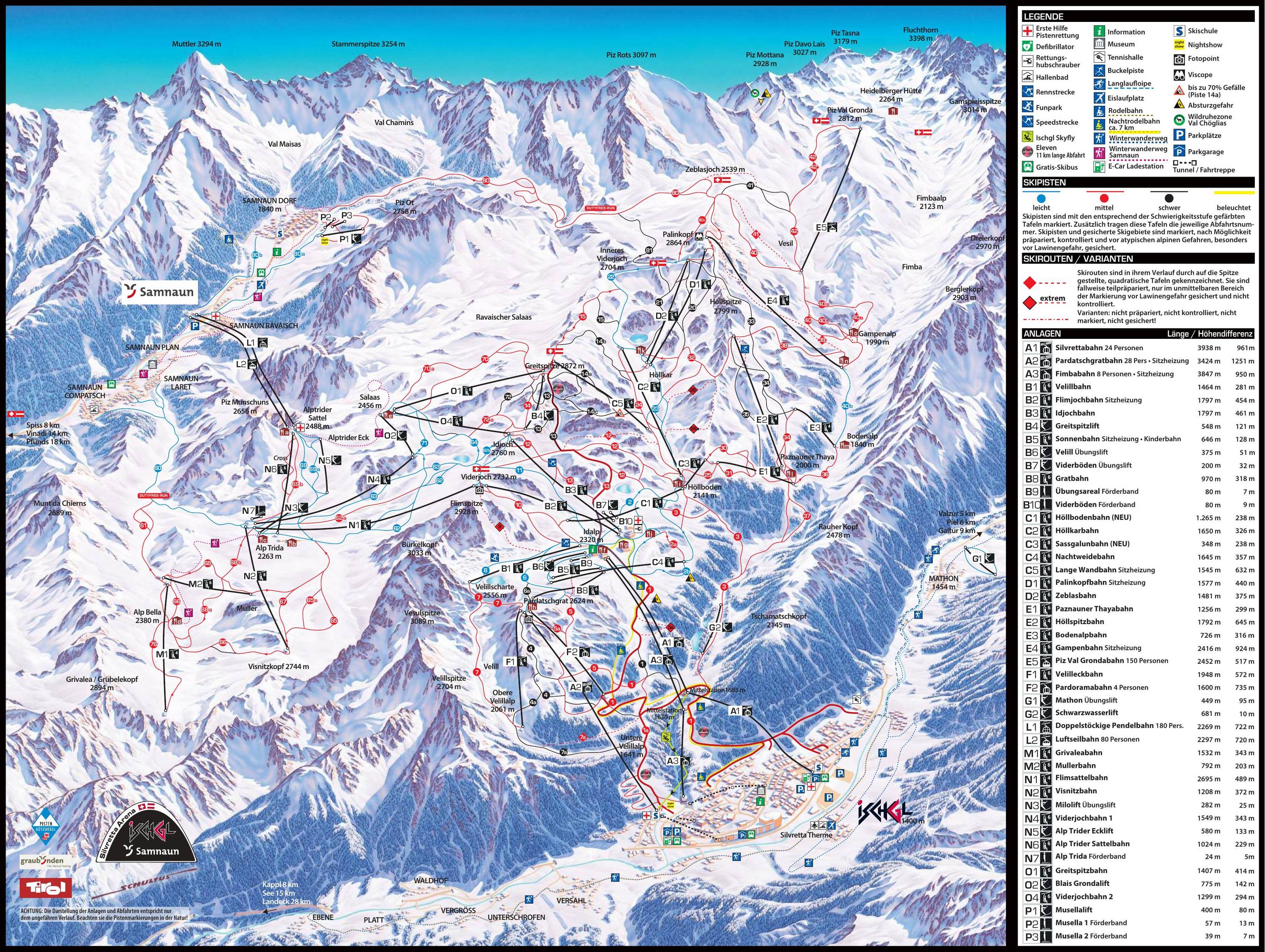 Der Pistenplan bildet das grenzüberschreitende Skigebiet von Ischgl und Samnaun sehr gut ab. Es sind alle Pisten, Lifte, Höhenangaben und Restaurants mit aufgenommen. Es gibt zudem einen eigenen Pistenplan für die Schmugglerrunden. Des Weiteren findet man Informationen zu den Skischulen, Veranstaltungen, Wanderwegen, Rodelbahnen und Skipasspreisen. Zusätzlich ist noch das komplette Paznauntal mit einem Pistenplan angeführt.