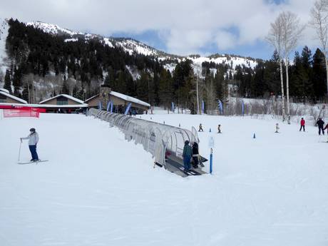 Die Kids Ranch bietet Programme für Kinder ab 3 Jahren – vom Skikindergarten bis hin zu Anfängerkursen. Direkt am Teton Village wartet ein überdachtes Förderband mit lustigen Figuren und viel Platz für die Kleinen.