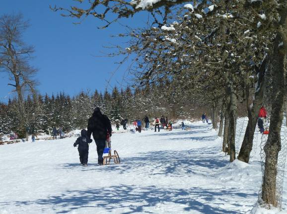 Auf dem gegenüberliegenden Hang gibt es außerdem eine besonders schöne Rodelstrecke, die gegen die Straße sogar mit einem Fangzaun gesichert ist, falls jemand zu schnell unterwegs ist.